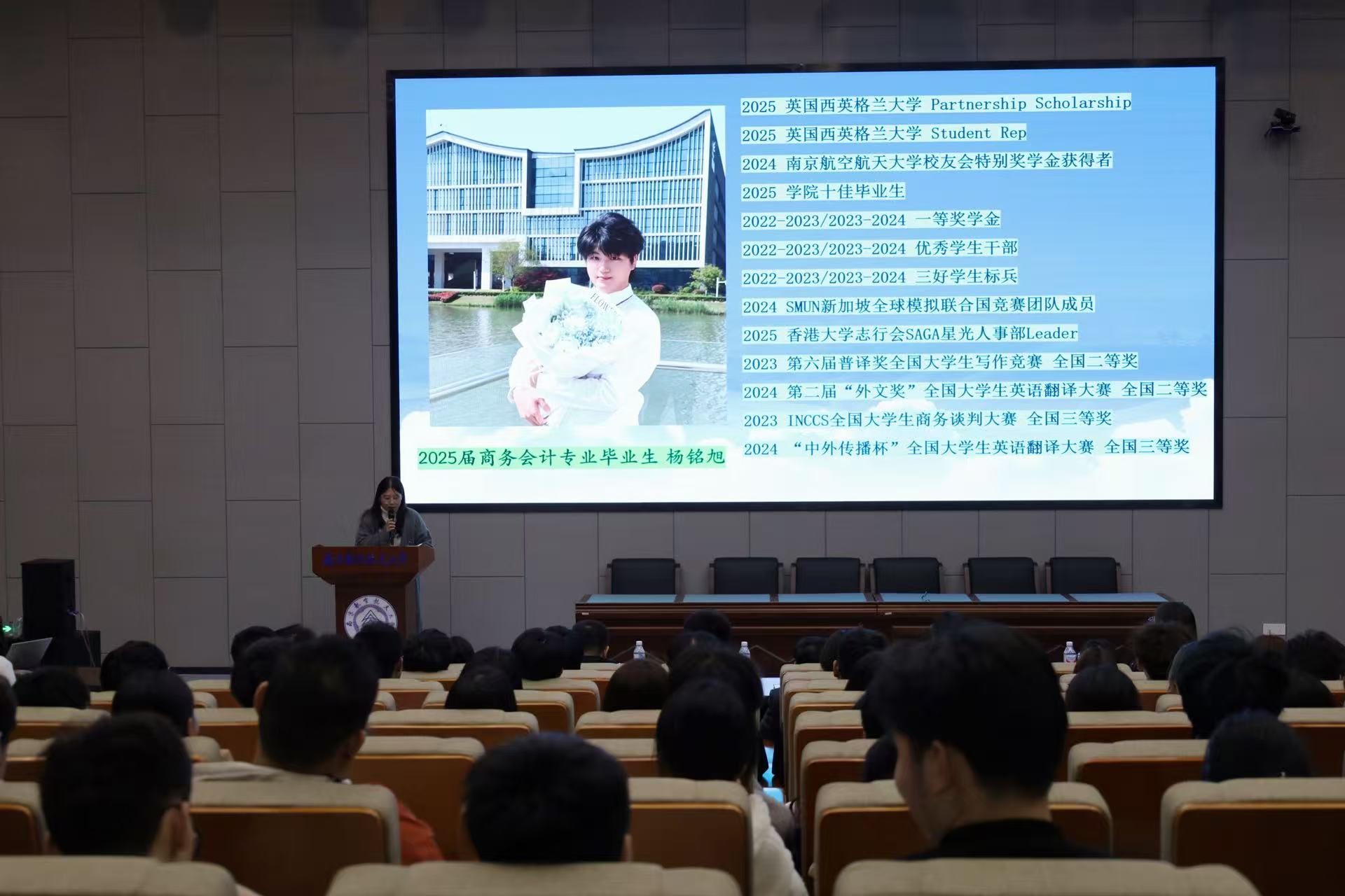 2025届毕业生代表杨铭旭通过视频形式与新生展开交流。杨铭旭同学在校期间表现卓越,屡次在全国大学生英语竞赛等国家级赛事中取得优异成绩,并以卓越的学业表现被英国西英格兰大学录取,荣获该校针对SQA AD项目学生的唯一最高奖学金。他结合自身学习经验,从雅思备考、专业学习、海外申请等多个维度提出宝贵建议,激励学弟学妹们珍惜校园时光,以自律和坚持追寻梦想。