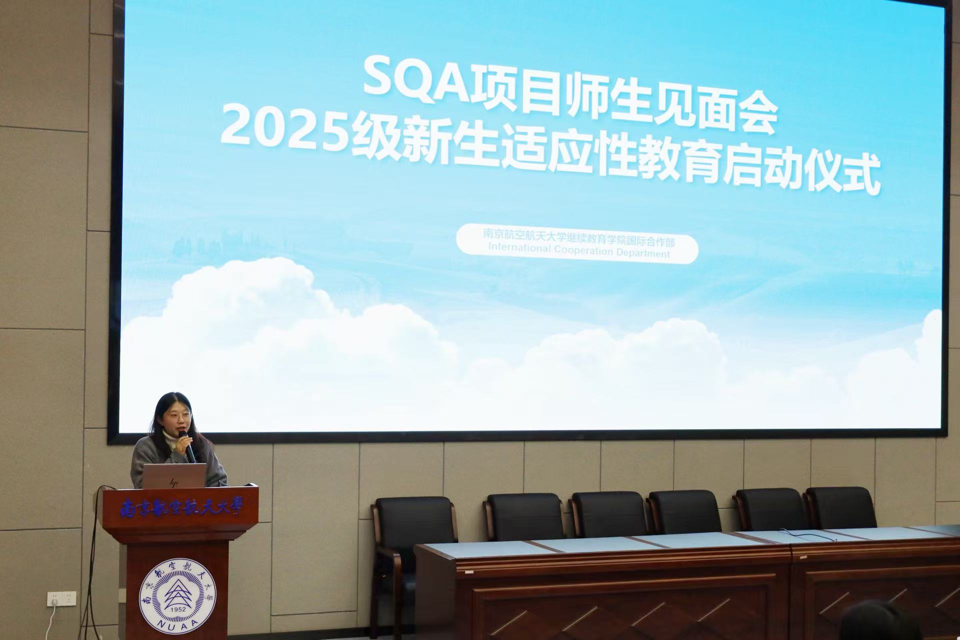 10月23日晚,南京航空航天大学SQA AD项目师生见面会暨2025级新生适应性教育启动仪式在天目湖校区尚德楼报告厅隆重举行。此次活动的目的是搭建师生之间的交流平台,帮助新生迅速适应校园生活,为他们的国际求学之旅奠定坚实基础。继续教育学院院长江爱华、教师代表、国际合作部全体成员、相关学生工作人员以及SQA AD项目2025级全体新生共同参与了此次活动,活动由国际合作部主任邹望蠡主持。