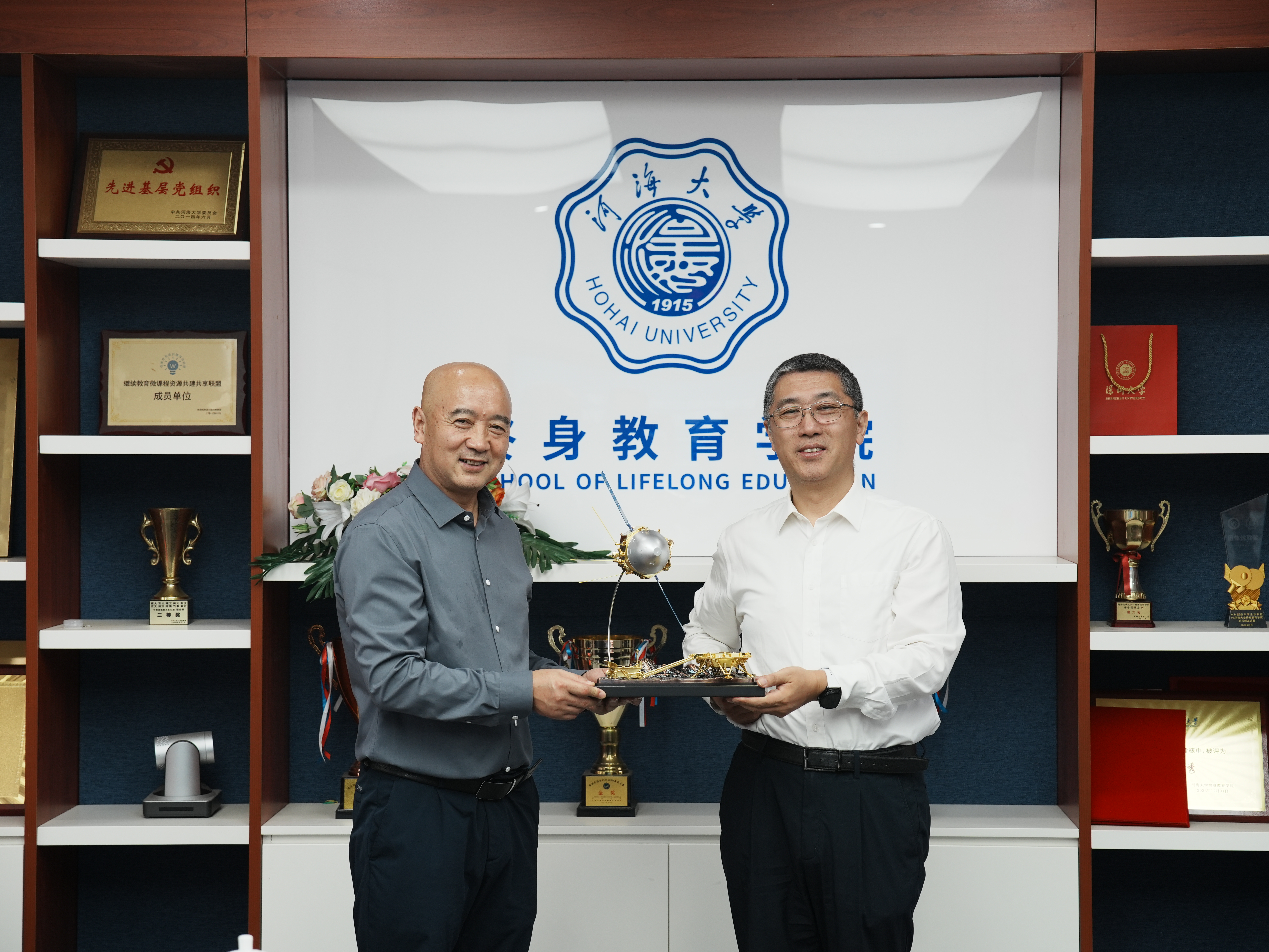 座谈结束后,刘建成代表学院向河海大学终身教育学院赠送了象征探索精神的“天问一号”模型,寓意两校在继续教育创新发展的道路上携手并进,共同迈向新征程。
