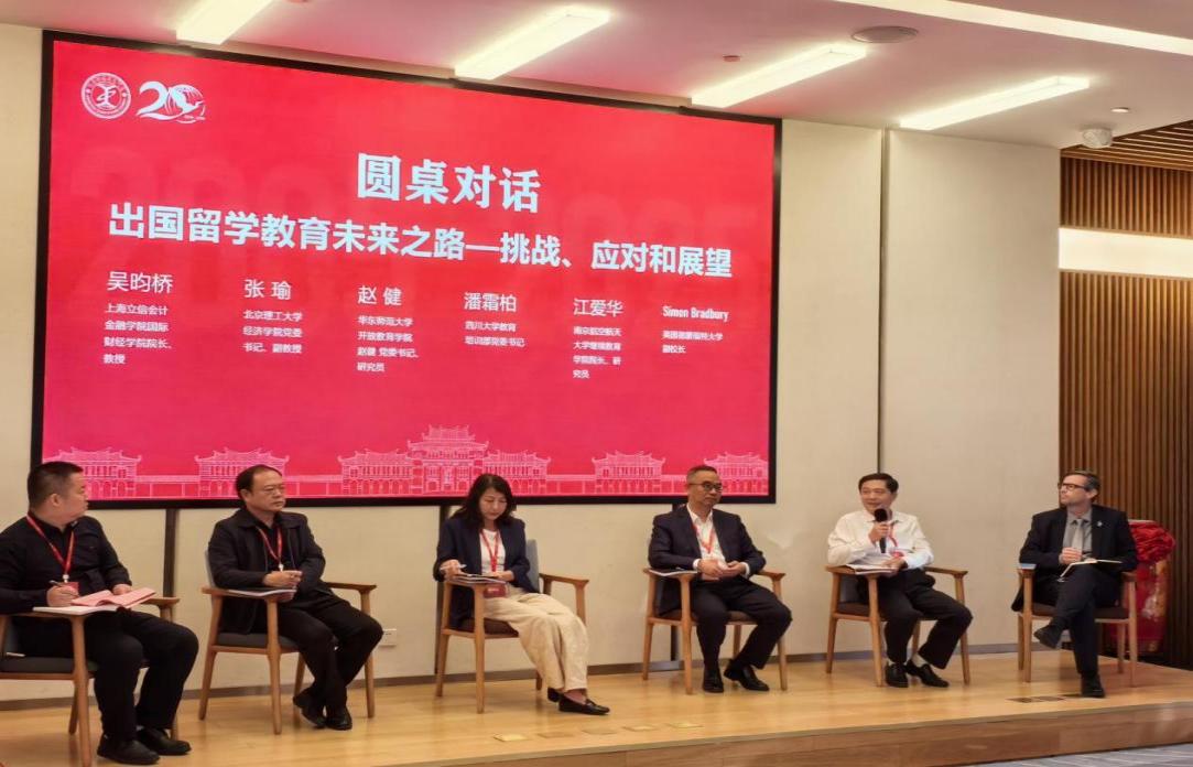 圆桌对话以《出国留学教育未来之路——挑战、应对和展望》为主题,上海立信会计金融学院国际财经学院院长吴昀桥主持,英国德蒙福特大学副校长Simon Bradbury、北京理工大学经济学院党委书记张瑜、华东师范大学开放教育学院党委书记赵健、四川大学教育培训部党委书记潘霜柏、以及我院院长江爱华参加对话研讨。对话嘉宾从宏观到微观角度畅谈了在后疫情时代,全球高等教育治理、数字化转型等变革加速演进形势下,出国留学教育实践过程中遇到的问题、对策及寄望。江爱华在圆桌对话中谈到,当前出国留学教育正面临全球化退潮、政策波动与技术革命的叠加冲击,南京航空航天大学通过一体化运行破局,重构了“三横三纵”国际合作体系,坚持自招、自办、自管不动摇,探索出一条“资源整合—服务升级—生态共建”的路径。未来的留学教育需进一步向“价值创造”转型,通过产学研深度融合、数字化服务升级、全球教育治理参与,以学生发展为核心重构国际教育生态。