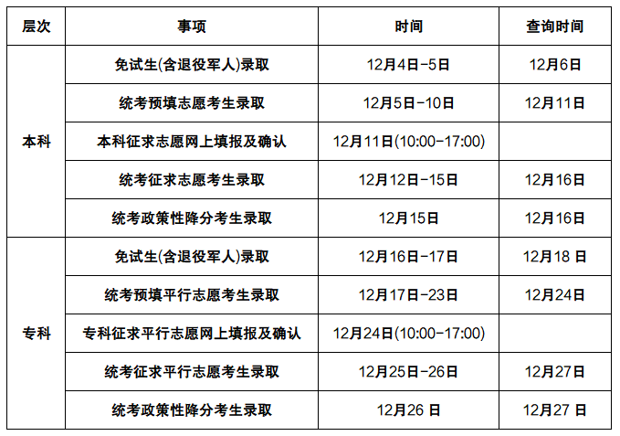 我省2025年成人高校招生录取工作将于12月4日至26日进行,现将具体日程公布如下。请考生按相应查询时间登录我院门户网站(www.jseea.cn)“查询中心”查询录取结果。