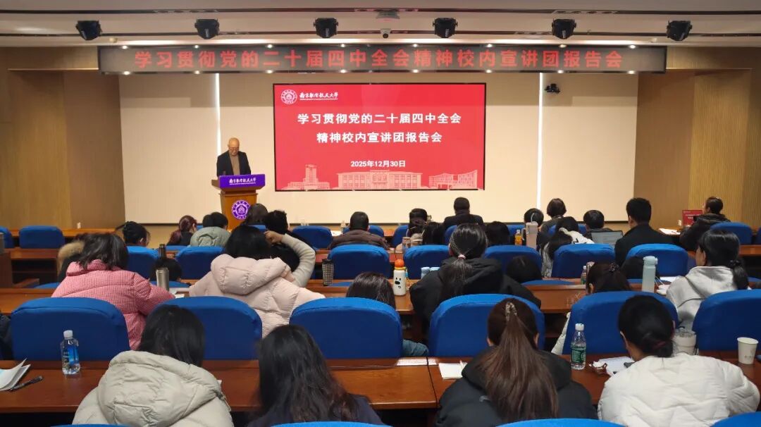 为深入学习贯彻党的二十届四中全会精神,深刻领会、全面把握全会精神的丰富内涵与核心要义,切实把全院师生的思想和行动统一到党中央决策部署上来,12月30日,继续教育学院举行学习贯彻党的二十届四中全会精神校内宣讲团报告会。本次报告会特邀校内宣讲团成员、马克思主义学院孙会娟副教授作专题辅导。学院班子成员、全院教工参加学习,报告会由学院党委书记刘建成主持。