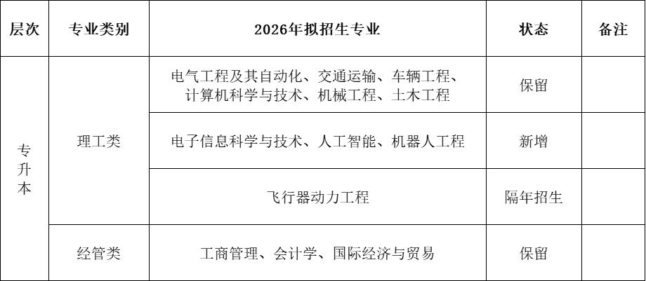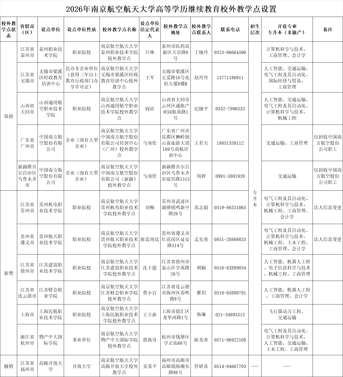 根据《教育部办公厅关于严格规范高等学历继续教育校外教学点设置与管理工作的通知》(教职成厅〔2022〕1号)要求,现将2026年南京航空航天大学高等学历继续教育招生专业和校外教学点的设置进行公示: