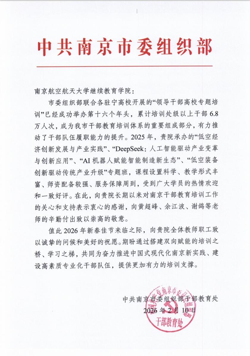 近日,中共南京市委组织部干部教育处向南京航空航天大学继续教育学院发来感谢信,对学院在南京市领导干部教育培训工作中的专业化组织能力和高质量实施成效给予充分肯定,对学院长期以来主动服务全市干部队伍建设大局表示衷心感谢,并在2026年新春佳节来临之际,向学院全体教师职工致以诚挚的问候和美好的祝愿。