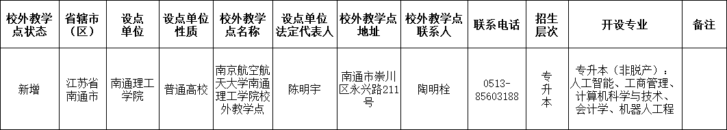 根据《教育部办公厅关于严格规范高等学历继续教育校外教学点设置与管理工作的通知》(教职成厅〔2022〕1号)要求,现将2026年新增南京航空航天大学高等学历继续教育南通理工学院校外教学点的相关情况予以公示: